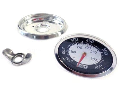 2-1/2″ X 2″ oval temperature gauge for Weber Q3200, 2014 and newer”. Features a 1-3/4″ long temperature probe with mounting wing nut, 150 to 600 degrees temperature range on black and silver background with Weber Logo.