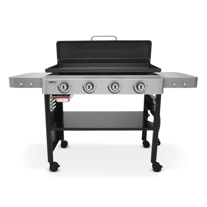 Scrambled, cheesy eggs with crisp bacon, toasted Italian paninis and juicy smashed burgers with caramelized onions are just the beginning of what you can create on your Weber Griddle. Featuring a specially engineered 3-burner system, this high-performance griddle is designed to provide fast, even heat from edge-to-edge. Quickly reaching searing temperatures over 500˚F, it’s just what you need to cook a salmon filet on a busy weeknight or a batch of burgers on a Saturday afternoon. This spacious griddle includes 2 side tables to prep, serve and keep tools handy, while the griddle itself gives you space to cook an entire meal at once, so all of your food is ready at the same time. Its high-capacity grease management system helps prevent spills, making cleanup a snap. Say hello to your new culinary playground. Gather, griddle and savor something good with the Weber Griddle. • 36,000 BTU burner system engineered to provide fast, even heat• High-capacity front grease tray helps prevent spills• Durable aluminized steel cookbox helps prevent corrosion• 2 sturdy workspace side tables and 4 tool hooks• Easy-slide hard cover helps protect griddle from the elementsGrill SpecificationsTotal BTU-per-hour input36,000 Dimensions – Lid Open (inches)41.45″ H x 53.46″ W x 23.94″ D Dimensions – Lid Closed (inches)37.79″ H x 53.55″ W x 23.56″ D Total cooking area (square inches)504 Weight (pounds)110.25 Stainless steel burners3 Fuel typeLiquid Propane (20 lb. tank sold separately) Side tables2 Durable all-weather wheels2 Tool hooks4 Cook surface materialHot-rolled steel cooktop